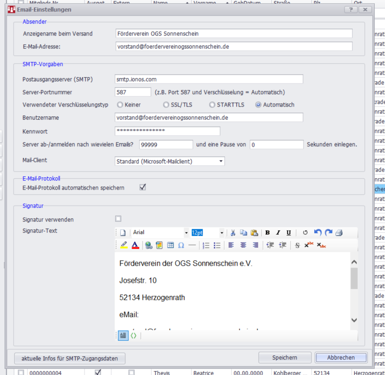 wir haben ein Email Konto bei Ionos. Gemäß dem Provider habe ich Benutzer, SMTP, Passwort bei SPG eingetragen. Ich habe so ziemlich alle Varianten an Einstellmöglichkeiten probiert: Port 465, Port 587, alle angebotenen Sicherheitsprotokolle, den alternativen Clienten, aber es kommt immer die Fehlermeldung vom SMTP server - authentication required. Bei Ionos habe ich in den Einstellungen gesucht, aber es gibt keine Möglichkeit den Zugriff von Software auf das Konto einzuschränken. Habt ihr vielleicht einen Tipp wie es noch funktionieren könnte? Hat jemand vielleicht mit mit SPG Version 4.3.0.32 ähnliche Probleme mit Email Konten? Oder liegt es an Ionos?