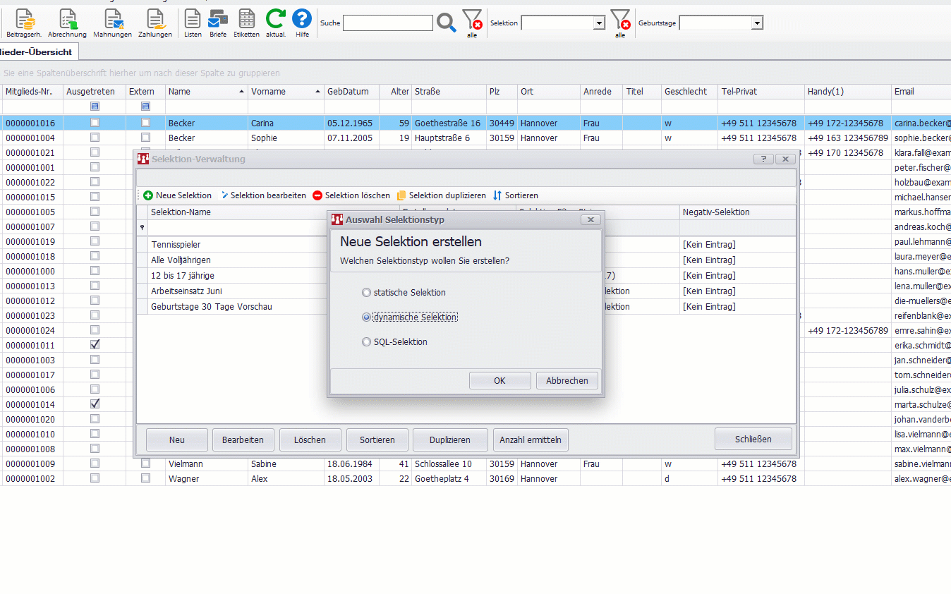Selektionen: Filtern Sie Ihre Mitglieder nach beliebigen Kriterien (z. B. alle Gardetänzerinnen, alle Mitglieder des Elferrats, alle Jubilare). Erstellen Sie dynamische oder statische Gruppen für spezifische Aktionen.