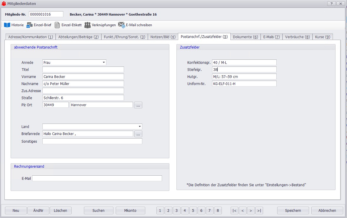 Nutzen Sie Zusatzfelder, um logistische und traditionelle Details direkt beim Mitglied zu speichern. Legen Sie beispielsweise Felder für die Uniformverwaltung an (Konfektionsgröße, Mützengröße, Litewka vorhanden?), um Bestellungen zu vereinfachen. Auch Ehrungen lassen sich hier perfekt abbilden.
