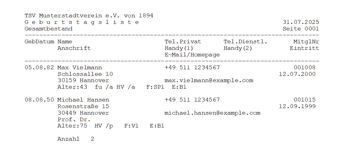 Dank des integrierten Listengenerators können Sie neben den vielen Standardberichten (Mitgliederstatistik, Geburtstagslisten, Jubiläen etc.) auch komplett eigene, passgenaue Auswertungen für Ihre spezifischen Anforderungen erstellen.