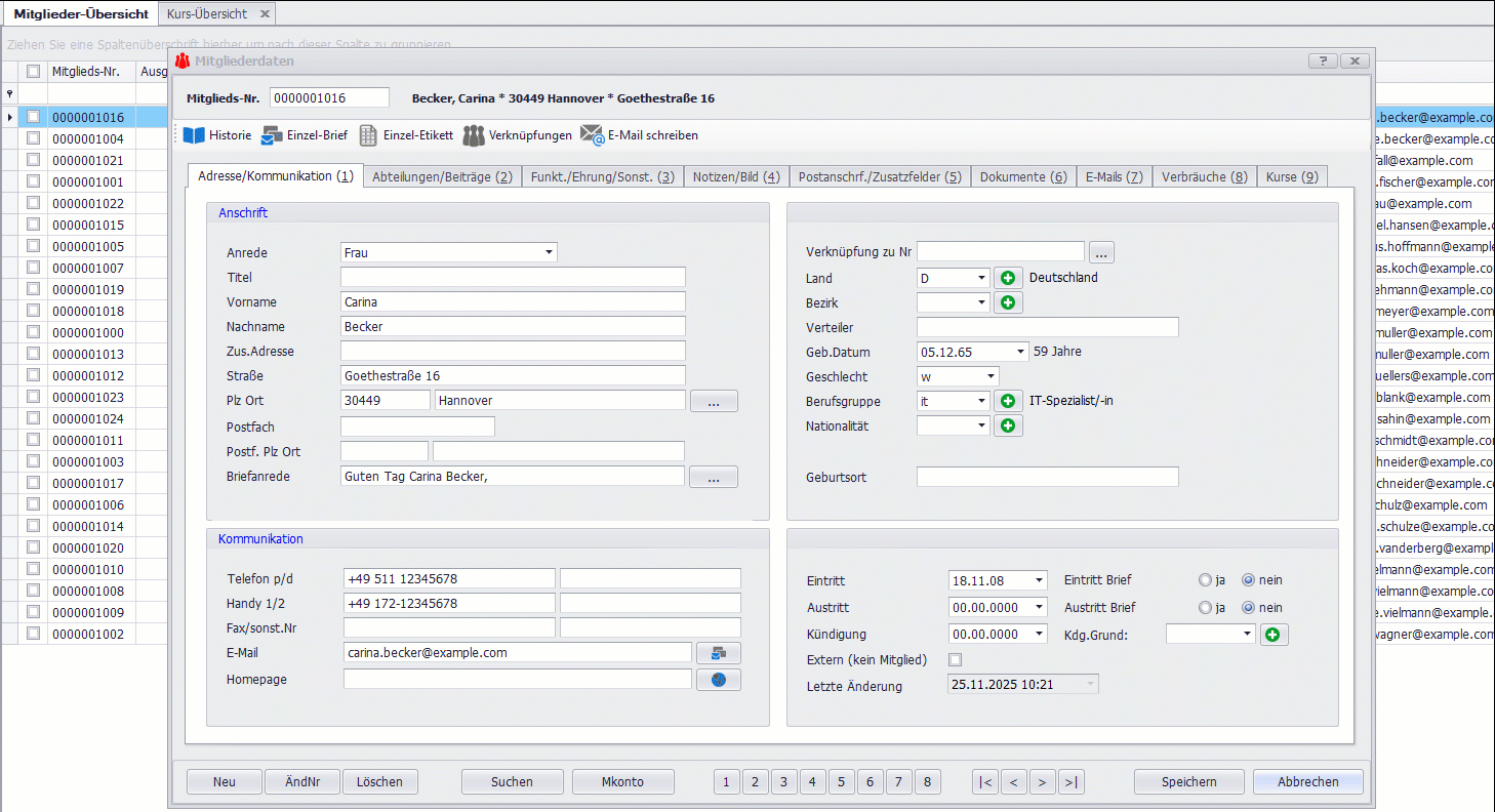 In den Stammdaten des Mitglieds sehen Sie jederzeit eine Übersicht aller belegten Kurse und deren Abrechnungsstatus. Ein Blick in die Historie genügt, um sofort zu erkennen, ob eine Kursteilnahme bereits fakturiert wurde oder noch zur Abrechnung aussteht.