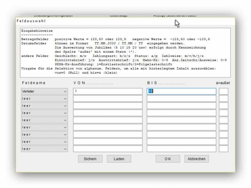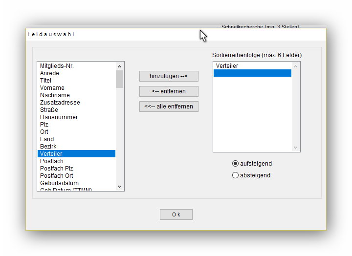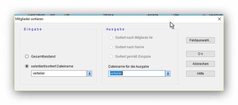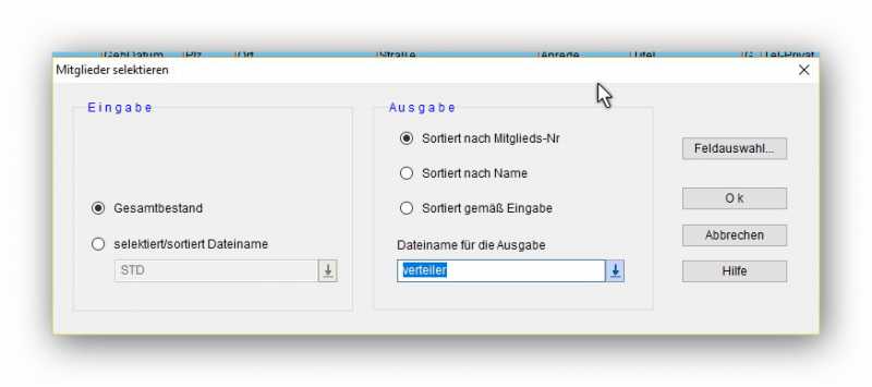 1.selektieren Sie den Bestand über "Mitglieder-Mitgl.selektieren-alle" benennen Sie die Datei "Verteiler"