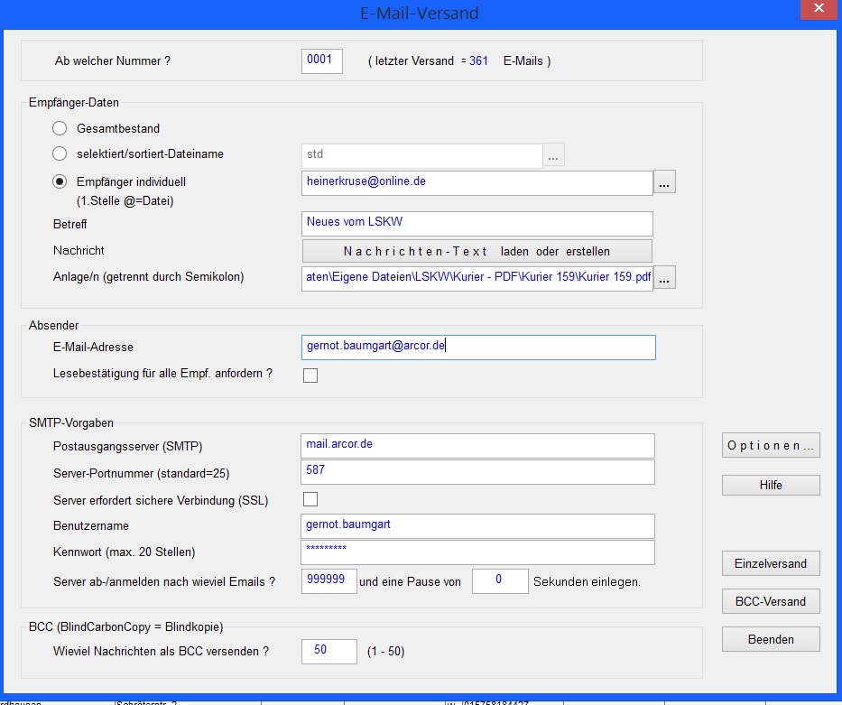 Egal ob ich BCC-Versand oder Einzelversand wähle, ich bekomme immer die Fehlermeldung: " Verbindung nicht möglich !"