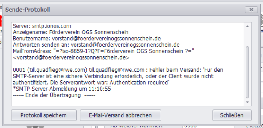 wir haben ein Email Konto bei Ionos. Gemäß dem Provider habe ich Benutzer, SMTP, Passwort bei SPG eingetragen. Ich habe so ziemlich alle Varianten an Einstellmöglichkeiten probiert: Port 465, Port 587, alle angebotenen Sicherheitsprotokolle, den alternativen Clienten, aber es kommt immer die Fehlermeldung vom SMTP server - authentication required. Bei Ionos habe ich in den Einstellungen gesucht, aber es gibt keine Möglichkeit den Zugriff von Software auf das Konto einzuschränken. Habt ihr vielleicht einen Tipp wie es noch funktionieren könnte? Hat jemand vielleicht mit mit SPG Version 4.3.0.32 ähnliche Probleme mit Email Konten? Oder liegt es an Ionos?