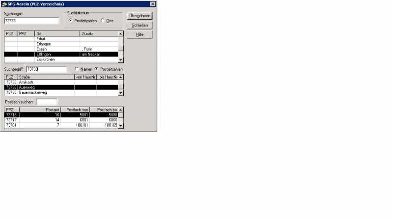 Wird in SPG-Verein die richtige PLZ eingegeben und mit "Enter" abgeschlossen, wird der dazugehörige Ort automatisch eingesetzt, somit kann es keine Unstimmigkeiten mehr geben.
