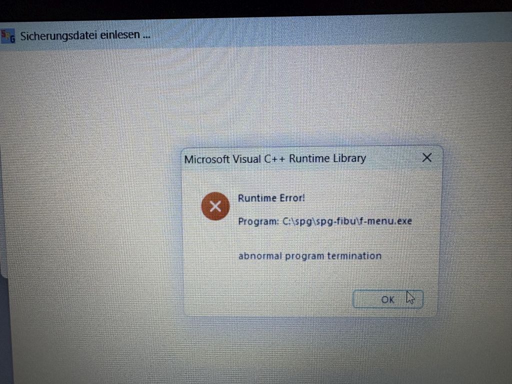 ich bekomme hin und wieder einen Runtime Error bei der Rücksicherung einer Datensicherung, Dies passiert i.d.R. wenn ich z.B. diverse Buchungen vorgenommen habe, dabei Fehler festgestellt habe und dann die letzte Sicherung einspielen will. Bei Auswahl der Datensicherungsdatei bekomme ich einen Runtime Error (sh. angehängte Fehlermeldung) und das Programm stürzt ab. Ist da eine Ursache für bekannt?