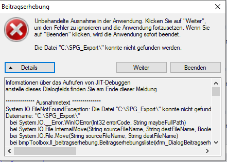 Nach dieser Änderung möchte ich eine Beitragserhebung durchführen und erhalte eine Fehlermeldung. Vor der o.g. Änderung hat alles funktioniert.
