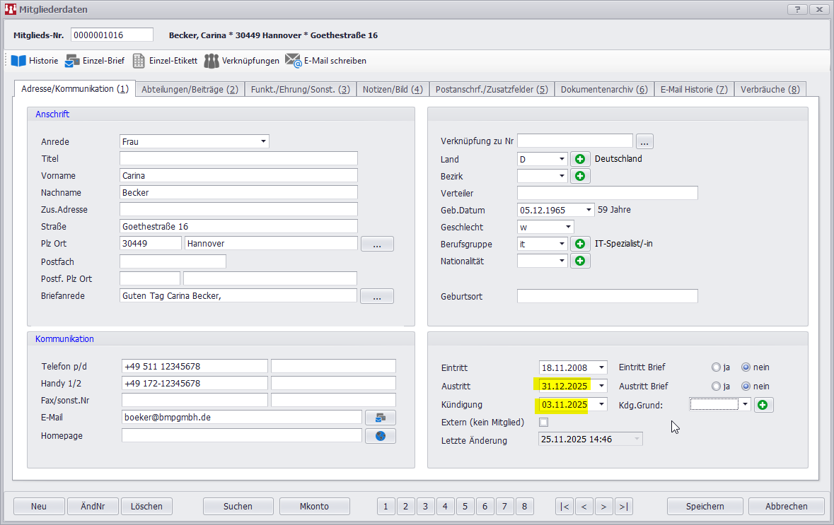 Das Austrittsdatum muss in der Vergangenheit liegen, damit die Mitglieder in der Übersicht mit dem Häkchen markiert werden. Also alle Mitglieder, die zum 31.12.2025 gekündigt haben, werden heute noch als normale, aktive Mitglieder in allen Listen angezeigt und auch in der Übersicht ist der Haken noch nicht sichtbar. Das ändert sich dann am 1.1.2026