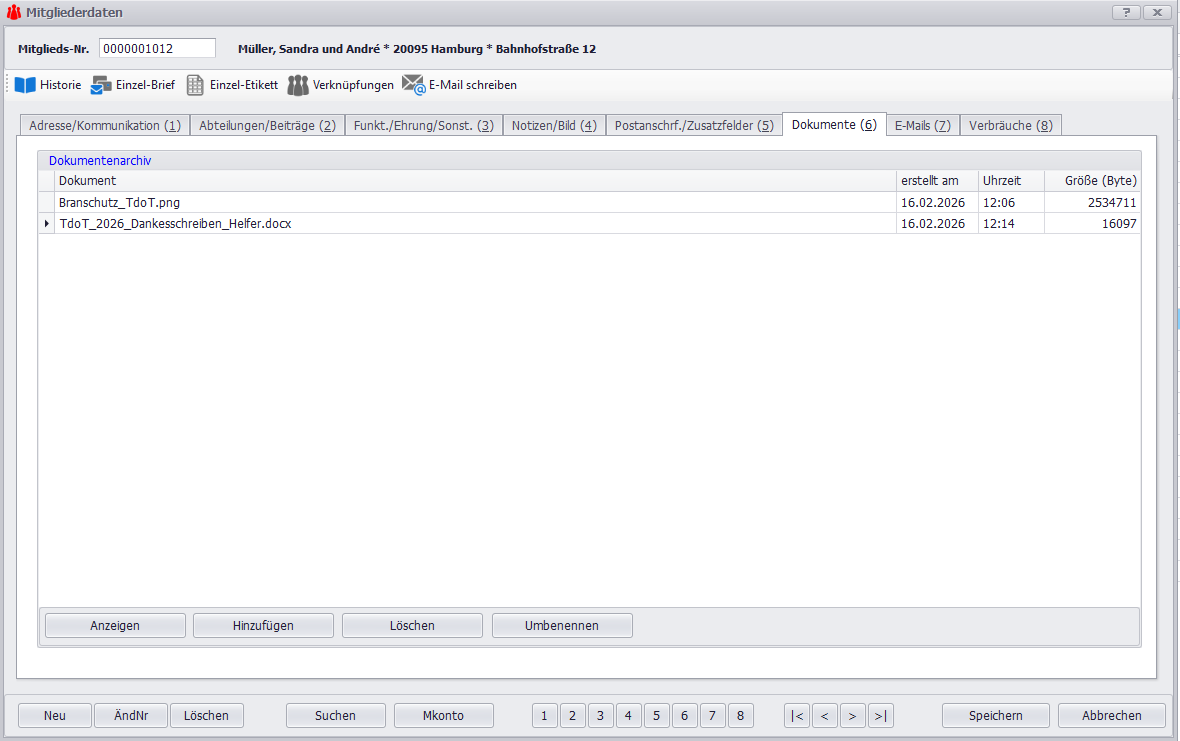 Über das Modul Verbräuche definieren Sie zunächst die Materialien unter Stammdaten (z.B. "Bierzeltgarnitur", "Faltpavillon"). In den Mitgliederdaten der jeweiligen Helfer buchen Sie die Ausgabe ein (Datum, Artikel, Menge). Nach der Veranstaltung erfassen Sie die Materialrückgabe, dokumentieren die Einnahmen und archivieren Fotos der Brandschutzerziehung im Dokumentenarchiv. Per Serienbrief bedanken Sie sich bei allen Helfern.