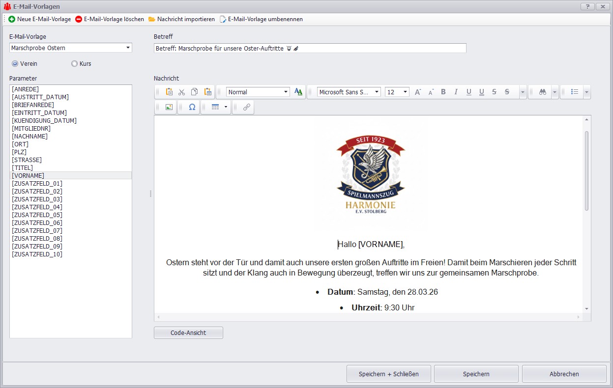 Der Dirigent benötigt für die Vorbereitung eines Umzugs alle Musiker des "Hauptorchesters" und des "Spielmannszugs". Der Schriftführer erstellt eine dynamische Selektion, die Mitglieder aus diesen beiden Abteilungen filtert. Anschließend nutzt er die Funktion E-Mail Versand , wählt diese Selektion aus und versendet über eine E-Mail-Vorlage eine individualisierte E-Mail ("Hallo [VORNAME], die nächste Marschprobe findet am...") an alle betreffenden Musiker.