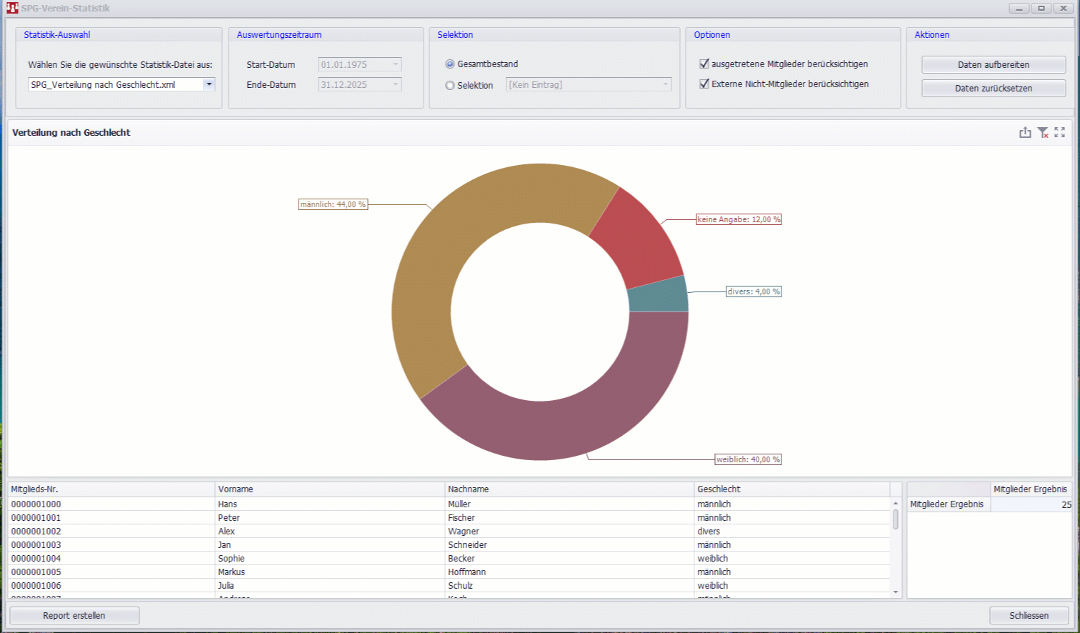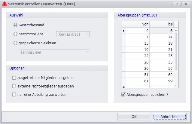 Dank des integrierten Listengenerators können Sie neben den vielen Standardberichten (Mitgliederstatistik, Geburtstagslisten, Jubiläen etc.) auch komplett eigene, passgenaue Auswertungen für Ihre spezifischen Anforderungen erstellen.