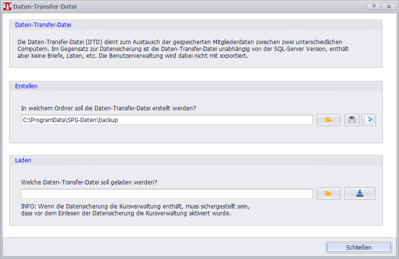 Die Daten-Transfer-Datei (DTD) dient zum Austausch der gespeicherten Mitgliederdaten zwischen zwei unterschiedlichen Computern.