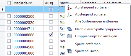 Das Kontextmenü des Datengrids wird aufgerufen, wenn Sie mit der rechten Maustaste auf die Spaltenüberschrift klicken.