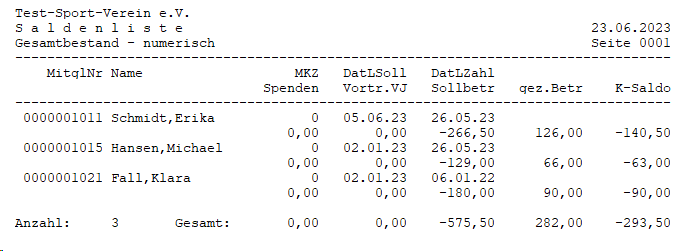 Die Saldenliste ist eine aperiodische Liste, das heißt, sie kann zu jedem Zeitpunkt erstellt werden. Sie gibt Auskunft über den aktuellen Stand der Mitgliedsbeiträge und der Kontensalden.