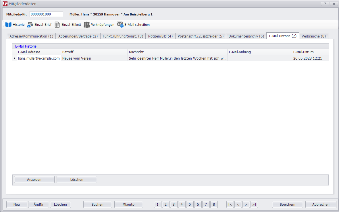 Auf dieser Registerkarte werden diejenigen E-Mails aufgelistet, die über den Menüpunkt "Mitglieder" > "E-Mail-Versand" verschickt wurden.